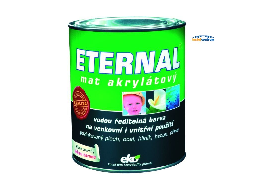 ETERNAL mat akrylátový je hedvábně matná, akrylátová, vodou ředitelná barva pro venkovní i vnitřní použití. Je určen k novým i udržovacím nátěrům pozinkovaného plechu (i bez předchozí oxidace), oceli opatřené antikorozním základním nátěrem, hliníku (přilnavost nutno předem ověřit). Lze jej použít i k nátěrům nepochozího betonu, mědi, nepochozího dřeva a betonu, neglazované keramiky a dalších stavebních materiálů. Svojí kvalitou je vhodný i pro zpracování při průmyslových aplikacích. Nátěry jsou vysoce elastické, mají dlouhodobou životnost.