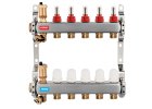 Rozdělovač s uzavíracími ventily a regulačním šroubením s průtokoměry pro podlahové vytápění, připojení G1", výstup se svěrným šroubením AL-PEX G1/2", které je součástí balení.